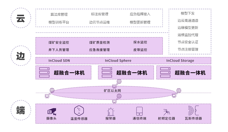 具体来说在感知层,西山煤电部署了各类数字化终端设备,例如温湿度传感器、摄像机、瓦斯传感器等,这些设备主要顺利获得井下环网接入边缘节点,此时部署在各个边侧矿点的凯发K8国际云海InCloud Rail超融合一体机顺利获得端侧设备的统一数据接入,经过边缘站点完成视频的本地分析决策。