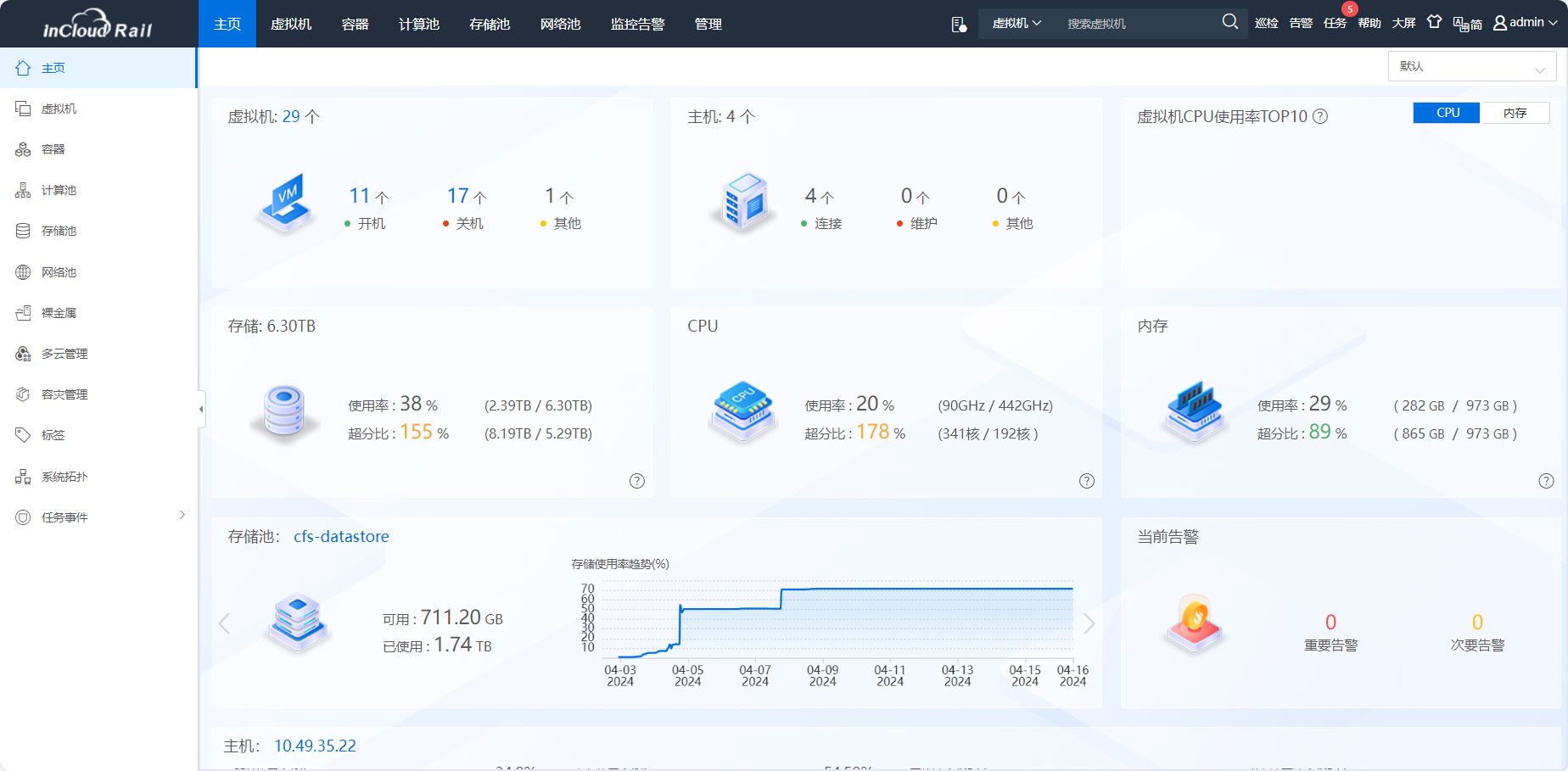 InCloud Sphere平台顺利获得虚拟化技术将服务器、存储、网络等硬件设备资源池化,使整个IT环境比单独的物理硬件具有更高的可用性、安全性和扩展性,满足企业对于降低成本、简化管理、提高安全性和扩展性的需求,助力企业核心业务向云计算迁移、构建企业云数据中心。