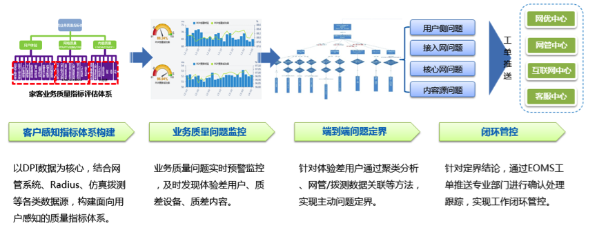 面向用户体验、网络质量、内容质量,建立家客业务质量指标评估体系,固化端到端问题定界规则。打造家客业务质量闭环管理体系,顺利获得IT化流程实现家客业务质量管理闭环与效果评估 。