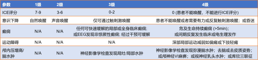 美国移植与细胞治疗学会(ASTCT)共识建议使用ARYOX-10筛选工具进行评估。同时将视盘水肿、颅内压、影像学诊断作为分级因素。参照Neelapu等提出的《CAR-T治疗相关毒性(10分)》评分系统及相关建议可以将 ICANS分为如图7所示的4个等级。