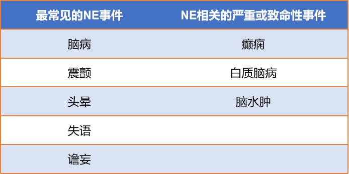 ICANS包括CAR-T细胞相关性脑病综合征(CRES)和其他免疫治疗继发的神经系统异常,是免疫治疗后或继发于输注T细胞或内源性免疫效应细胞激活或应答所导致的中枢神经系统的病理过程和功能失调[11]。其发生率为20%~64%,发生时间为输注后4天,最常持续5-17天,可能与CRS同时发生、或在CRS缓解后发生、或在未发生CRS情况下发生[12]。Gust等[13]研究表明,内皮激活和血脑屏障破坏均可能有助于CAR-T细胞进入CNS和神经毒性的发生,并强调了脑血管周细胞的重要作用。初步数据还表明参与T细胞顺利获得血脑屏障迁移的关键整合素之一α4β1的上调可能会促进CAR-T细胞进入大脑[14]。ICANS早期可表现为头痛、注意力减退、震颤、语言障碍和书写障碍;其他症状和体征包括谵妄、精神错乱、定向障碍和嗜睡。症状或体征可能是进行性的,可逐渐开展为全面失语、严重意识障碍、运动障碍、癫痫发作和脑水肿等[15]
